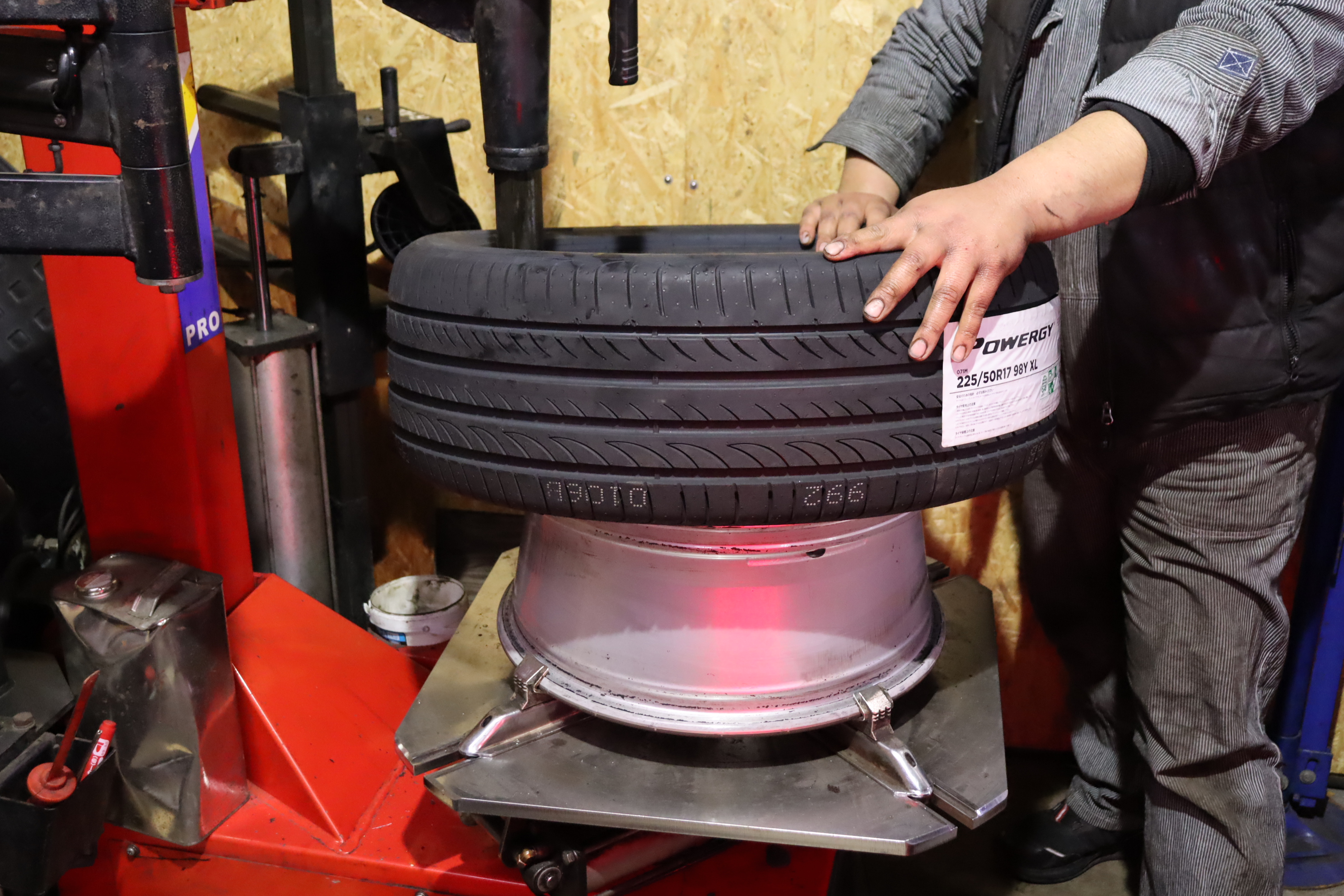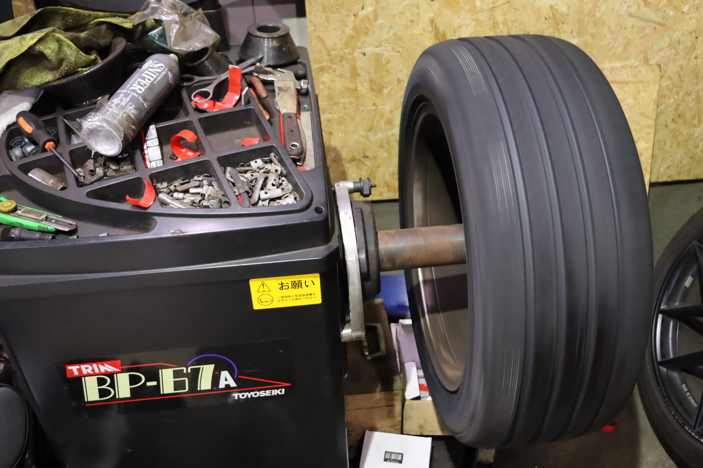 サクッと交換し専用タイヤバランサーにてしっかり測定・調整。取付前には裏面まで洗浄し完成。
